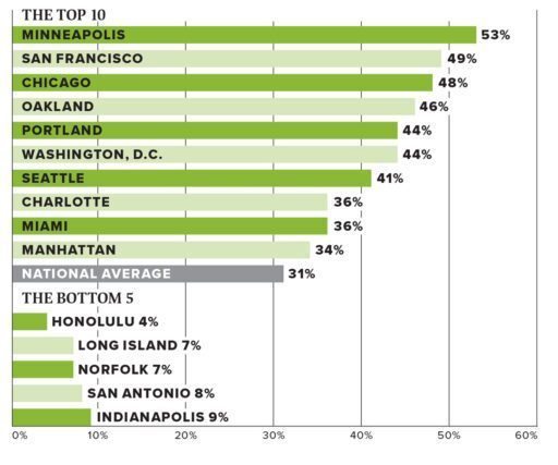 Seattle ranks No. 7 in the United States for percentage of LEED-certified square footage in office buildings. Commercial real estate firm CBRE says “tenants benefit from energy savings and increased productivity, while owners benefit from higher asset value.” LEED-certified buildings, on average, command 31% higher rents.